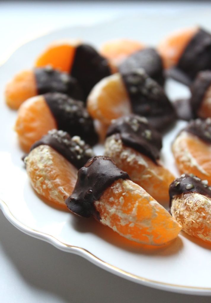 - Dip oranges in chocolate and place on parchment paper