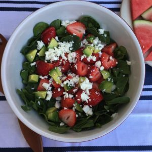 This salad is so fresh and delicious. I used local strawberries and picked fresh mint from the garden. Unfortunately, my spinach didn’t do well this year, so I decided to use other greens like arugula on a couple occasions. Like most people I tend to stick to simple meals when its hot outside and this salad comes together in under 10 minutes.