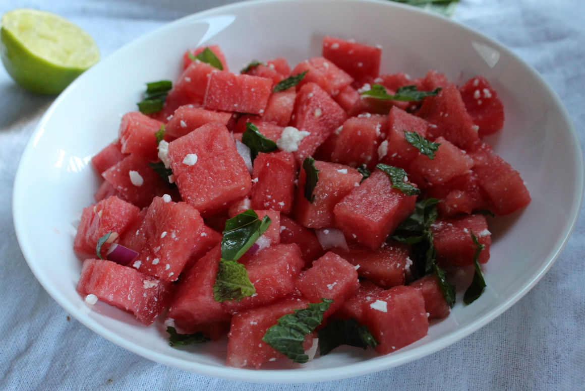It’s been a hot summer here on the west coast and my family and I have tried to make the best of these long summer days by using the BBQ more and making lots of salads. No one likes firing up the oven on these hot summer days. I can’t remember a summer this hot in what seems like forever, we love it. Eating an abundance of fresh local summer produce has been enjoyed in our house this summer. We recently went to a neighbourhood garden party and they served this watermelon and feta salad. It was simple but yet refreshing. This salad is a perfect side dish for a BBQ or picnic.