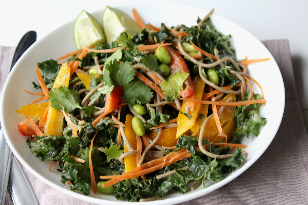 - ). Add soba noodles, peppers, carrots, edamame, cilantro,green onions to kale and toss with dressing.